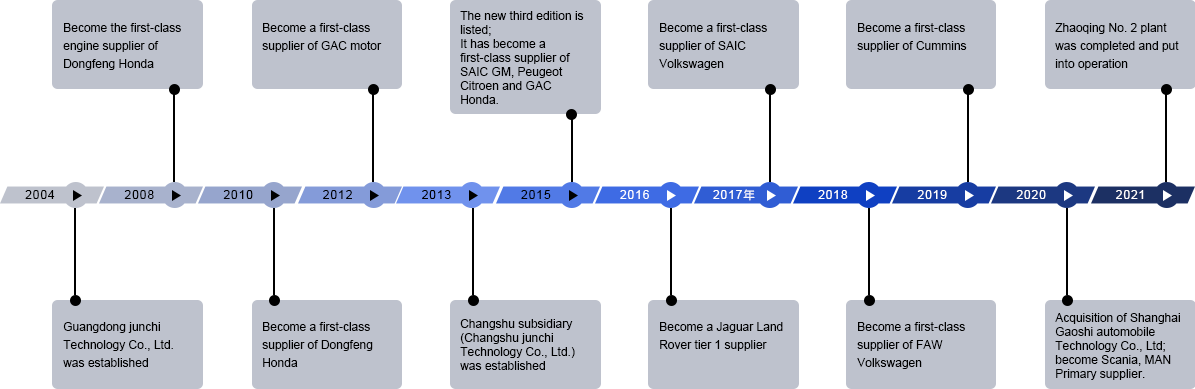 Based on the Pearl River Delta, the headquarters of the company has established subsidiary companies and institutions such as Guangdong junchi Technology Co., Ltd. No. 1 factory, No. 2 factory, Changshu junchi Technology Co., Ltd. and Shanghai Gaoshi R & D center, making full use of the advantages of auto parts industry cluster, becoming an excellent solution provider for engine and vehicle control components in the field of spare parts of major OEMs and automotive aftermarket. |